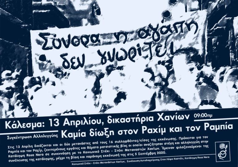 Την Τετάρτη 13 Απριλίου αναμένεται να εκδικαστεί η υπόθεση δύο μεταναστών, του Ραχίμ και του Ραμπία, οι οποίοι βρίσκονταν φιλοξενούμενοι στην κατάληψη Rosa Nera την ημέρα τής εκκένωσής της στις 5 Σεπτεμβρίου 2020. Σύμφωνα με το Κοινωνικό Στέκι – Στέκι Μεταναστών Χανίων, σε αντίθεση με τους άλλους 14 συλληφθέντες που δικαιώθηκαν και αθωώθηκαν, οι μετανάστες πήραν αναβολή, καθώς οι κλήσεις δεν τους επιδόθηκαν στη γλώσσα τους – «ακόμα μία απαράδεκτη περίπτωση που αναδεικνύει τον θεσμοποιημένο ρατσισμό των επίσημων αρχών», όπως χαρακτηριστικά επισημαίνεται στη σχετική ανακοίνωση.