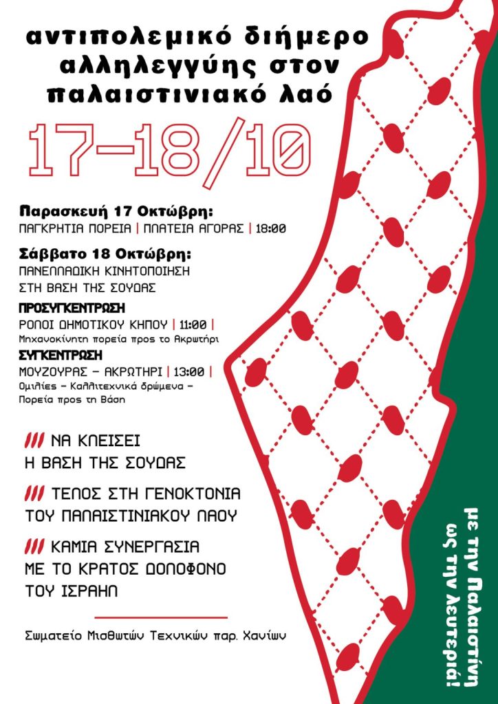 Αντιπολεμικό διήμερο δράσεων ενάντια στην αμερικανο-νατοϊκή βάση της Σούδας και παράλληλα έκφρασης της αλληλεγγύης στον δοκιμαζόμενο παλαιστινιακό λαό, διοργανώνεται στα Χανιά την Παρασκευή 17 και το Σάββατο 18 Οκτωβρίου 2025.
