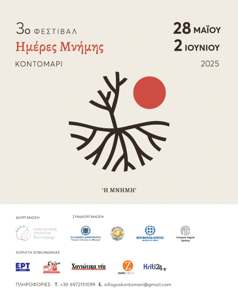 Φεστιβάλ διάρκειας έξι ημερών (28/5- 2/6) με θέμα: “Η Μνήμη”, διοργανώνουν για το 2025, ο Πολιτιστικός Σύλλογος Κοντομαρί σε συνεργασία με το Υπουργείο Πολιτισμού, την Περιφέρεια Κρήτης, τον Δήμο Πλατανιά και με το Γ.Α.Κ. – Ιστορικό Αρχείο Κρήτης. Κατά τη διάρκειά του θα παρουσιαστούν ποικίλες πολιτιστικές δράσεις.