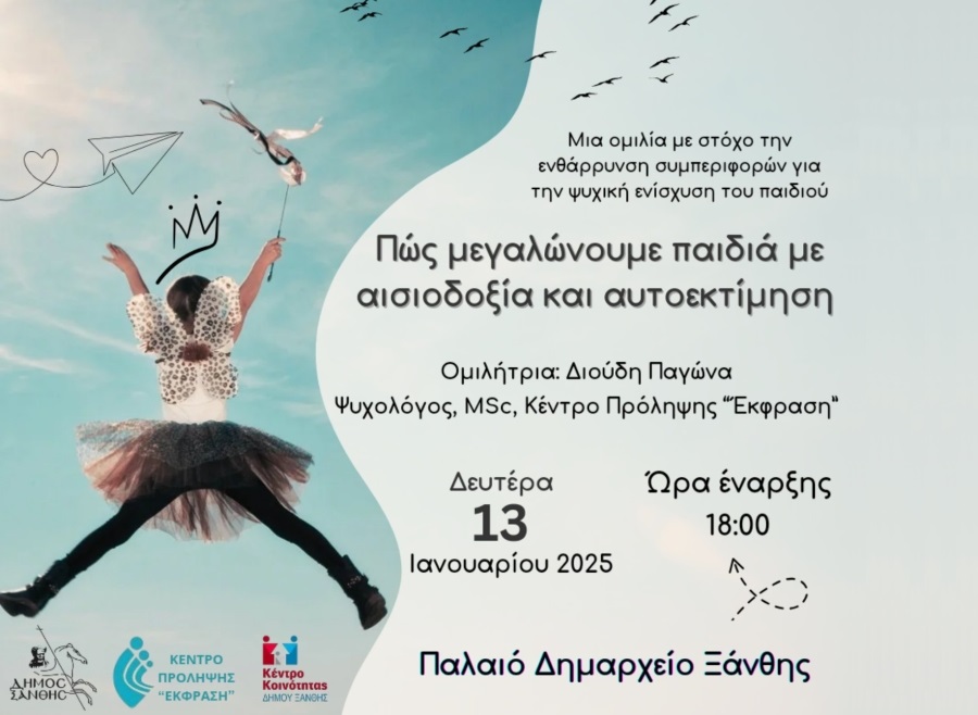 “Πώς μεγαλώνουμε παιδιά με αισιοδοξία και αυτοεκτίμηση”, είναι το θέμα της διάλεξης που θα δώσει η Ψυχολόγος MSc του Κέντρου Πρόληψης Ξάνθης “Έκφραση”, Παγώνα Διούδη, τη Δευτέρα 13 Ιανουαρίου στις 6 το απόγευμα στο Παλιό Δημαρχείο Ξάνθης.