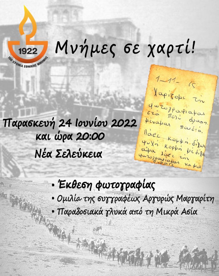 Εκδήλωση με θέμα «Μνήμες σε χαρτί», που σηματοδοτεί την έναρξη μιας σειράς εκδηλώσεων στην Ηγουμενίτσα, για τα 100 χρόνια από την Μικρασιατική Καταστροφή θα πραγματοποιηθεί την Παρασκευή 24 Ιουνίου 2022, στις 20:00, στη Νέα Σελεύκεια Ηγουμενίτσας.