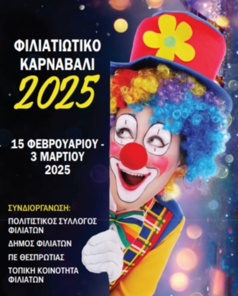 Το Φιλιατιώτικο Καρναβάλι 2025 ξεκινά, φέρνοντας κέφι, χρώμα και γιορτινή διάθεση σε ολόκληρη τη Θεσπρωτία! Ο ιστορικός θεσμός, που φέτος συμπληρώνει 66 χρόνια ζωής, διοργανώνεται από τον Πολιτιστικό Σύλλογο Φιλιατών, σε συνεργασία με τον Δήμο Φιλιατών, την Περιφερειακή Ενότητα Θεσπρωτίας και τη Δημοτική Κοινότητα Φιλιατών.
