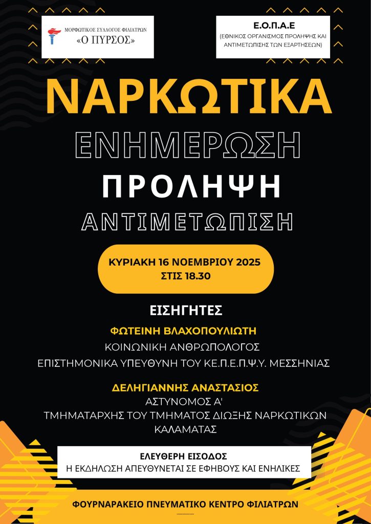 Ο Μορφωτικός Σύλλογος Φιλιατρών «Ο ΠΥΡΣΟΣ» θα πραγματοποιήσει μια σημαντική εκδήλωση με θέμα «Ναρκωτικά: Ενημέρωση, Πρόληψη και Αντιμετώπιση» στο Φουρναράκειο Πνευματικό Κέντρο, την Κυριακή (16 Νοεμβρίου 2025), στις 18:30.