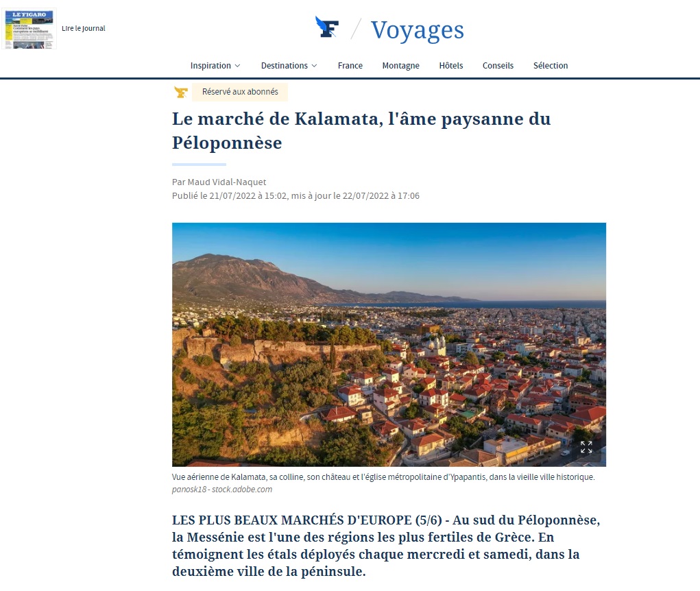 Την Αγορά της Καλαμάτας ξεχωρίζει, κατατάσσοντάς την στις καλύτερες της Ευρώπης, η γαλλική εφημερίδα «Le Figaro» στην ενότητα Voyages (Ταξίδια), την Πέμπτη 21 Ιουλίου 2022. Δείτε ΕΔΩ.
