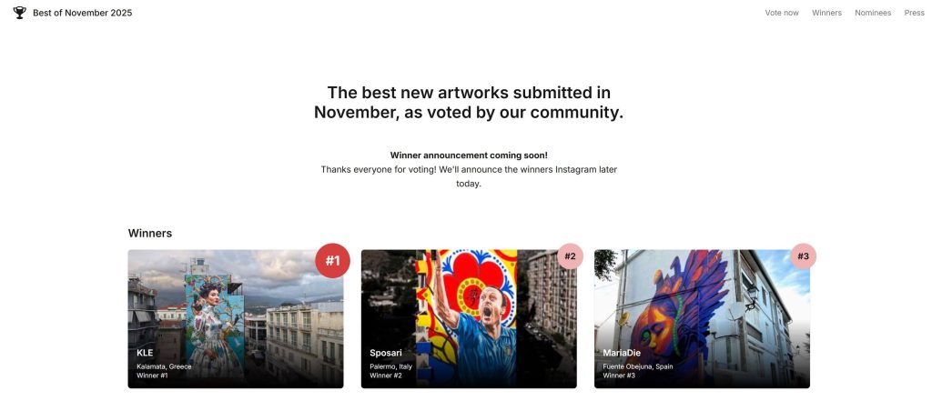 Η διάκριση προέκυψε μέσα από διεθνή ψηφοφορία χρηστών της πλατφόρμας, που ανέδειξαν το έργο της Καλαμάτας στην κορυφή μεταξύ εκατοντάδων συμμετοχών από όλο τον κόσμο. Ο δημιουργός της τοιχογραφίας εξέφρασε την ιδιαίτερη χαρά και συγκίνησή του, ευχαριστώντας όσους υποστήριξαν και μοιράστηκαν το έργο από την πρώτη στιγμή.