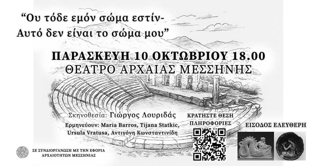 Η Αρχαία Μεσσήνη θα φιλοξενήσει την Παρασκευή (10 Οκτωβρίου 20225) στις 18.00, για πρώτη φορά, την παράσταση «Αυτό δεν είναι το σώμα μου», σε σκηνοθεσία του Γιώργου Λουριδά, όπου ζωντανεύουν ιστορίες ηρωίδων από τις “Μεταμορφώσεις” του Οβιδίου.
