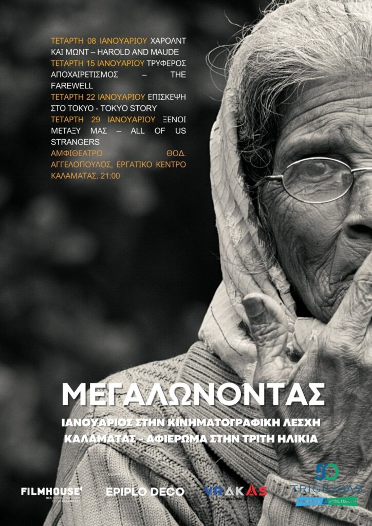 Η Νέα Κινηματογραφική Λέσχη Καλαμάτας/Filmhouse ξεκινά τη νέα χρονιά με ένα αφιέρωμα τον Ιανουάριο, στην τρίτη ηλικία. Δεν είναι λίγες οι φορές που ο κινηματογράφος έστρεψε την κάμερα επάνω στις ρυτίδες και στα σκυφτά κορμιά γερασμένων ανθρώπων αλλά ταυτόχρονα και στην σοφία και την πείρα τους, ανταμείβοντας το κινηματογραφικό στερέωμα με ανυπέρβλητες δημιουργίες.