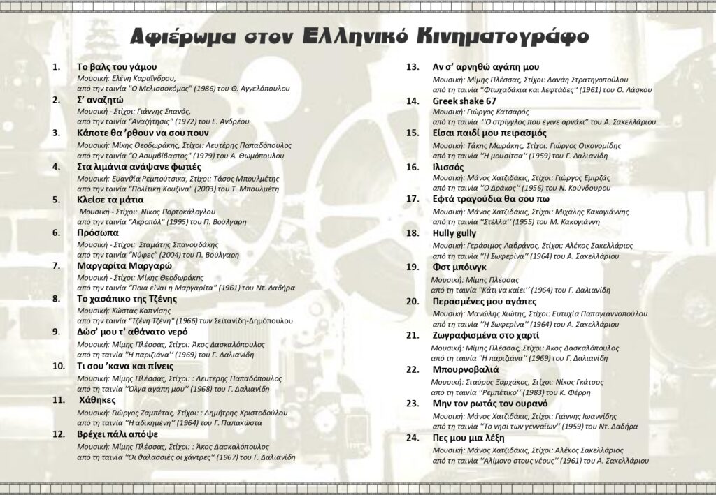 Πρόκειται για μια μουσική διαδρομή που καλύπτει σχεδόν 70 χρόνια δημιουργίας. Έργα και μουσικές που αγγίζουν τα βιώματα και την “χρυσή εποχή” του Ελληνικού Κινηματογράφου. Εκεί που ανάμεσα στο χιούμορ και την πρωτότυπη ατάκα, ο φόβος επιτρέπεται, η τόλμη επιβραβεύεται, το ανέφικτο γίνεται δυνατό και η ελπίδα γεννιέται.