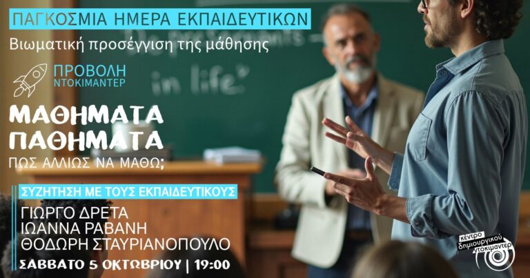 Με αφορμή την Παγκόσμια Ημέρα Εκπαιδευτικών, που καθιερώθηκε το 1994 από την UNESCO ως υπενθύμιση του καθοριστικού ρόλου που διαδραματίζουν οι εκπαιδευτικοί μέσα στην κοινωνία, το Κέντρο Δημιουργικού Ντοκιμαντέρ Καλαμάτας, προγραμματίζει μια εκδήλωση μετά προβολής, το Σάββατο (5 Οκτωβρίου 2024), στις 7.00 μ.μ..