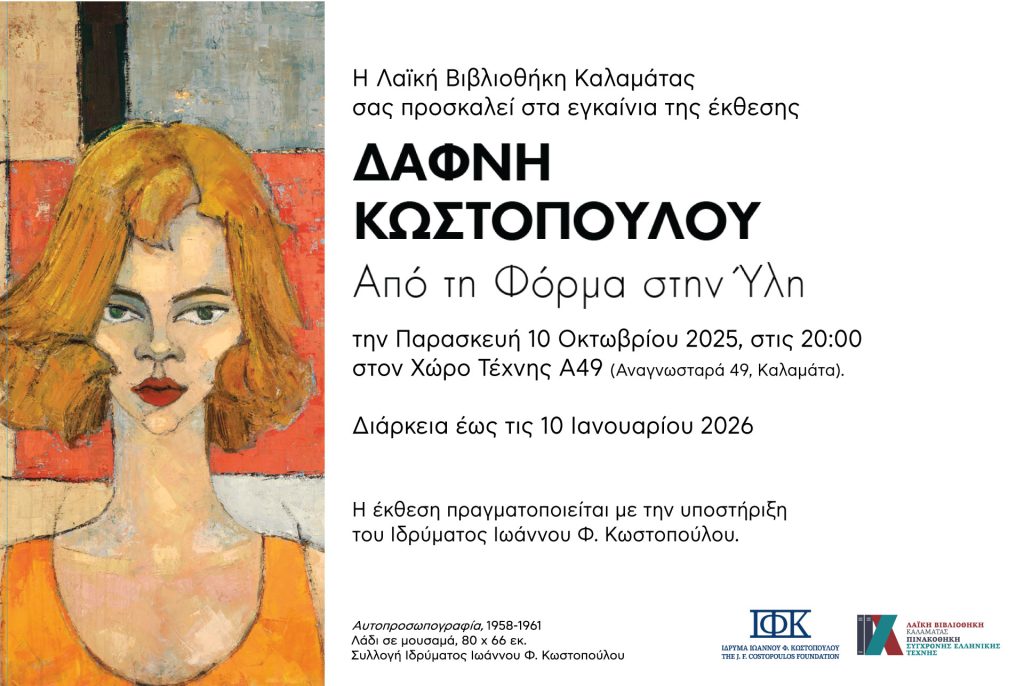 Την έκθεση «Δάφνη Κωστοπούλου: Από τη Φόρμα στην Ύλη», παρουσιάζει στον Χώρο Τέχνης A49(Αναγνωσταρά 49), η Λαϊκή Βιβλιοθήκη Καλαμάτας – Πινακοθήκη Σύγχρονης Ελληνικής Τέχνης, σε συνεργασία με το Ίδρυμα Ιωάννου Φ. Κωστοπούλου.