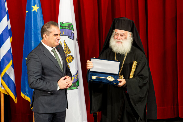 Αμέσως μετά ο Μακαριώτατος, επέδωσε το “Θυρεό” του Πατριαρχείου Αλεξανδρείας στον Δήμαρχο Καλαμάτας.