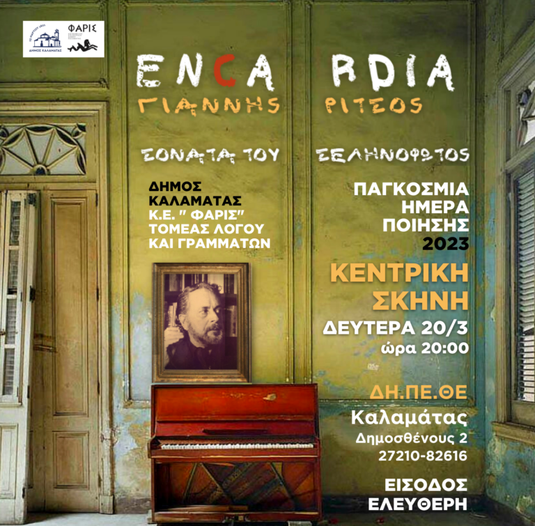 Εκδήλωση θα πραγματοποιήσει η Κ.Ε. Φάρις, αφιερωμένη στην Παγκόσμια Ημέρα Ποίησης, τη Δευτέρα (20 Μαρτίου 2023) στις 20.00, στο ΔΗ.ΠΕ.ΘΕ. Καλαμάτας με τη μουσική και θεατρική παράσταση η «Η Σονάτα του Σεληνόφωτος (1957)» του Γιάννη Ρίτσου.