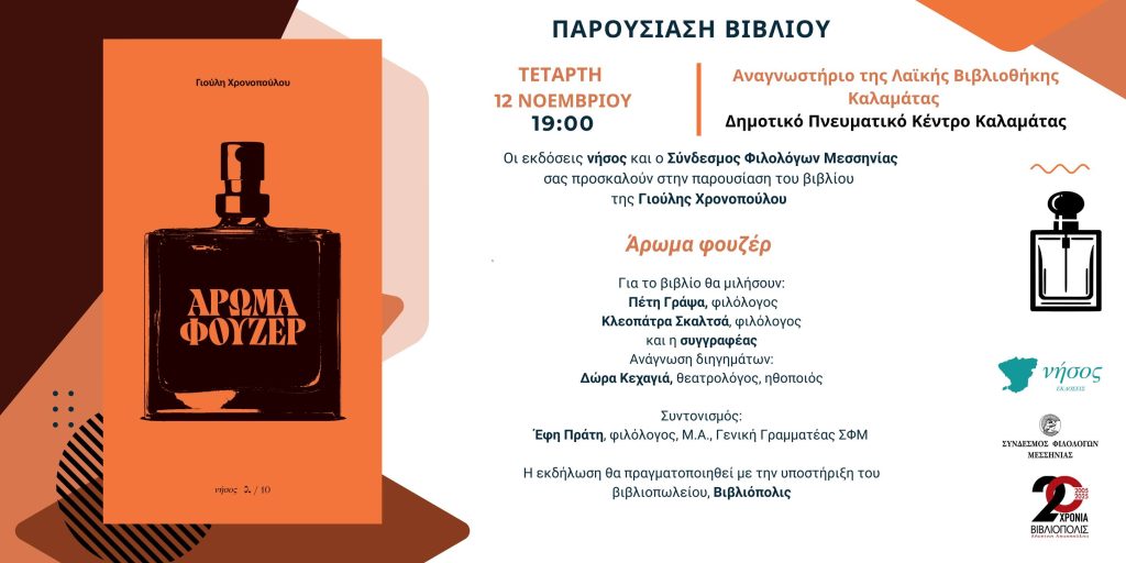 Παρουσίαση του βιβλίου της Γιούλης Χρονοπούλου με τίτλο “Άρωμα φουζέρ”, θα πραγματοποιηθεί στο Αναγνωστήριο της Λαϊκής Βιβλιοθήκης Καλαμάτας (Δημοτικό Πνευματικό Κέντρο Καλαμάτας), την Τετάρτη (12 Νοεμβρίου 2025), στις 19.00.