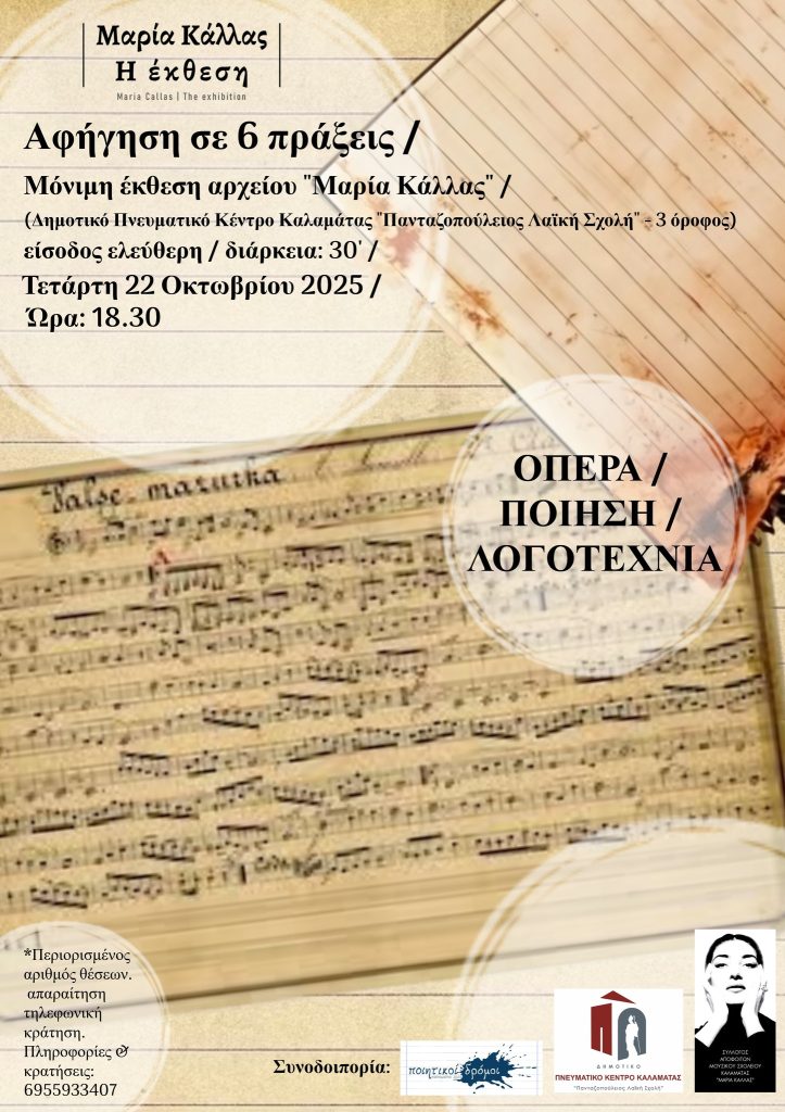 Στο πλαίσιο των παράλληλων εκδηλώσεων της δράσης “Ποιητικοί Δρόμοι” θα πραγματοποιηθεί μια ιδιαίτερη παράσταση, την Τετάρτη (22 Οκτωβρίου 2025), στις 18.30, εντός του χώρου της Έκθεσης του Αρχείου της Μαρίας Κάλλας, στον 3ο όροφο του Πνευματικού Κέντρου Καλαμάτας.