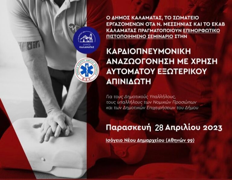 Tην Παρασκευή 28 Απριλίου θα πραγματοποιηθεί επιμορφωτικό πιστοποιημένο σεμινάριο στην «Καρδιοπνευμονική Αναζωογόνηση με χρήση Αυτόματου Εξωτερικού Απινιδωτή», στο ισόγειο του Νέου Δημαρχείου, Αθηνών 99, από το Δήμο Καλαμάτας, το Σωματείο Εργαζομένων ΟΤΑ Ν. Μεσσηνίας και το ΕΚΑΒ Καλαμάτας, για τους Δημοτικούς Υπαλλήλους, τους υπαλλήλους των Νομικών Προσώπων και των Δημοτικών Επιχειρήσεων του Δήμου.