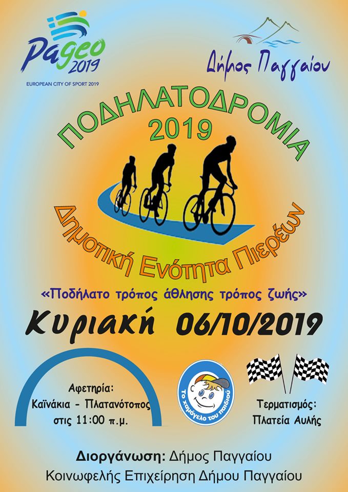 Με επίκεντρο την ανάγκη «υιοθέτησης» της χρήσης ποδηλάτου ως τρόπου άσκησης – ζωής, ο Δήμος Παγγαίου και η Κοινωφελής Επιχείρηση, διοργανώνουν την Κυριακή 6 Οκτωβρίου στις 11 το πρωί, στη Δημοτική Ενότητα Πιερέων, την 9η Ποδηλατοδρομία.