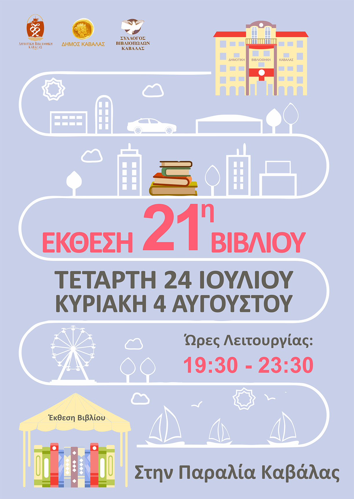 Ο λόγος είναι η Έκθεση Βιβλίου που πραγματοποιείται για 21η φορά, με τη συνεργασία του Δήμου Καβάλας, της Δημοτικής Βιβλιοθήκης «Βασίλης Βασιλικός» και του Συλλόγου Βιβλιοπωλών – Χαρτοπωλών Καβάλας. Πρόκειται για μία καλοκαιρινή δράση που έχει γίνει πλέον θεσμός στην Καβάλα με τη βοήθεια του αναγνωστικού κοινού και των επισκεπτών της παραλίας της πόλης με την υποστήριξη του Οργανισμού Λιμένος Καβάλας.