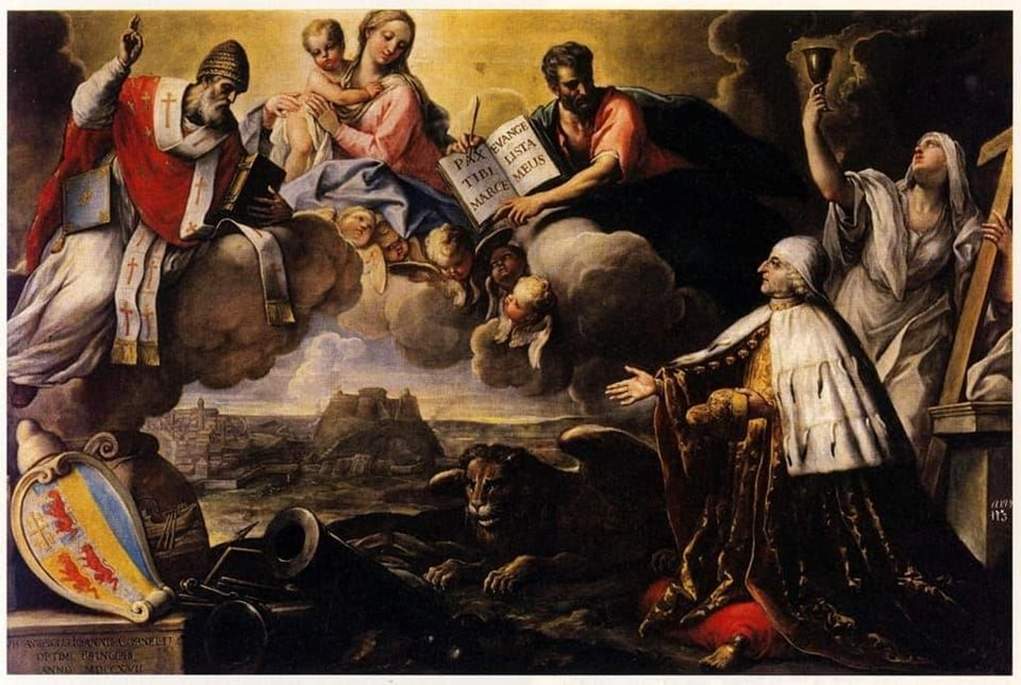 Φώτο: Πίνακας του Nicolò Bambini που παριστά τον Δόγη Ιωάννη Β’ Κορνέρ ή Κορνάρο (1709-22) να ευχαριστεί γονυπετής την Παναγία και τους Αγίους Μάρκο και Σπυρίδωνα για την λύση της οθωμανικής πολιορκίας της Κέρκυρας τον Αύγουστο του 1716. Αίθουσα Liagò του Παλατιού των Δόγηδων (Palazzo Ducale) της Βενετίας.