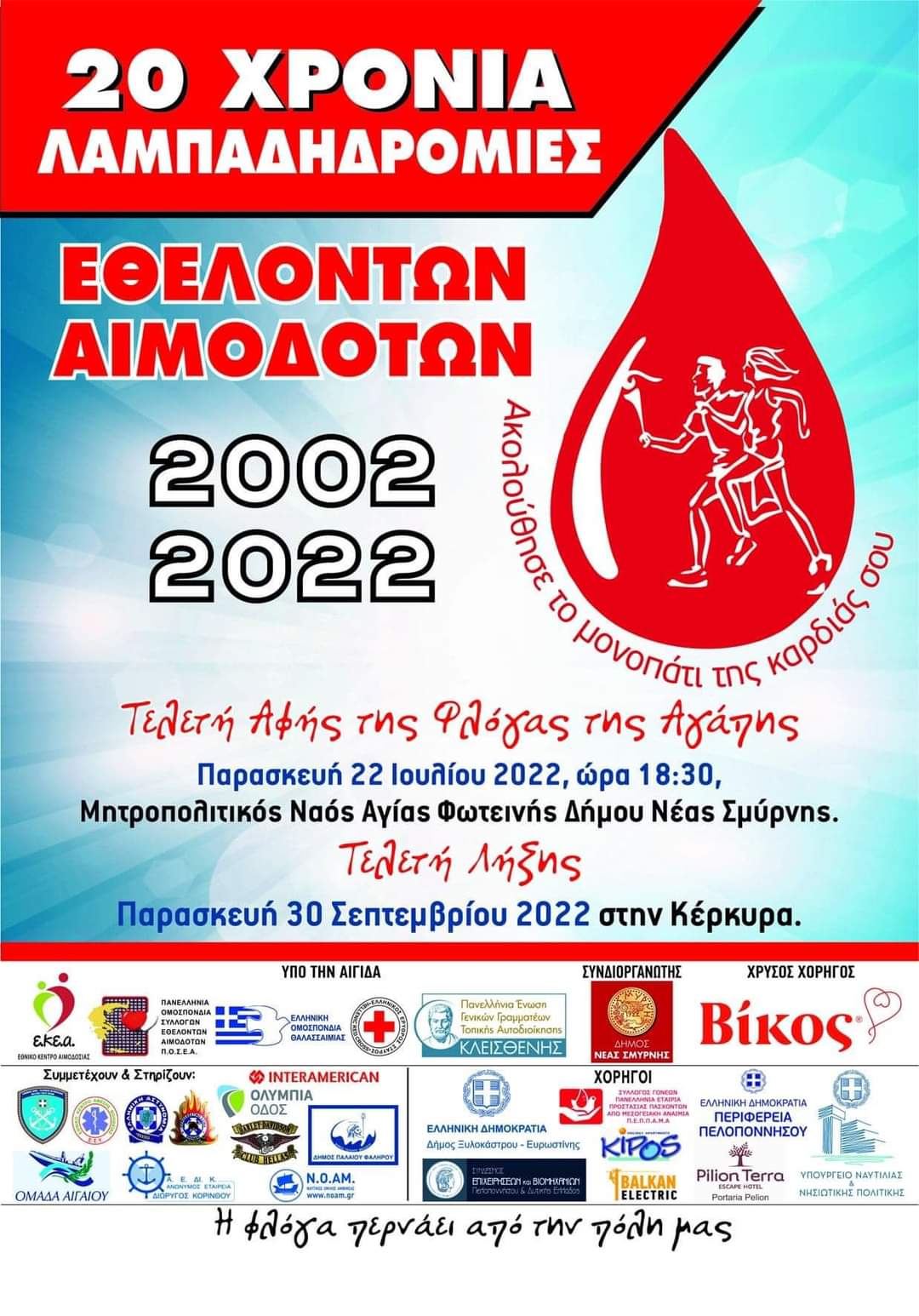 Στην Κέρκυρα θα καταλήξει αύριο Παρασκευή 30 Σεπτεμβρίου, η Φλόγα της Αγάπης της Εθελοντικής Αιμοδοσίας, μετά από ένα υπέροχο ταξίδι στην Ελλάδα, σημαίνοντας τη λήξη της 20ης Λαμπαδηδρομίας και την έναρξη των εργασιών της 32ης Αμφικτιονίας του Πανελληνίου Συνεδρίου Συλλόγων και Φορέων Εθελοντικής Αιμοδοσίας, που φιλοξενείται στο νησί, από τις 30/9/2022 έως την Κυριακή 2/10/2022.