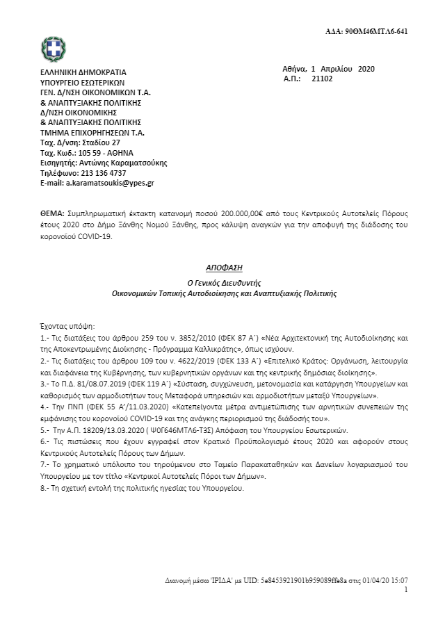 Πρόκειται για 200.000 ευρώ που κατανέμονται για προμήθειες υλικού, για την παροχή μέσων προστασίας των εργαζομένων, καθώς και λοιπών υπηρεσιών συναφών με την αντιμετώπιση της κατεπείγουσας και απρόβλεπτης ανάγκης για την λήψη μέτρων αποφυγής και διάδοσης του κορονοϊού COVID-19.