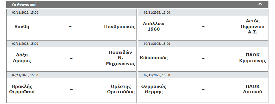 - Αετός Οφρυνίου – Α.Ο. Ξάνθης 0-3 (15′ Σουλεϊμάν Οκ., 68′ Βαφειάδης, 78′ Γκέκας)