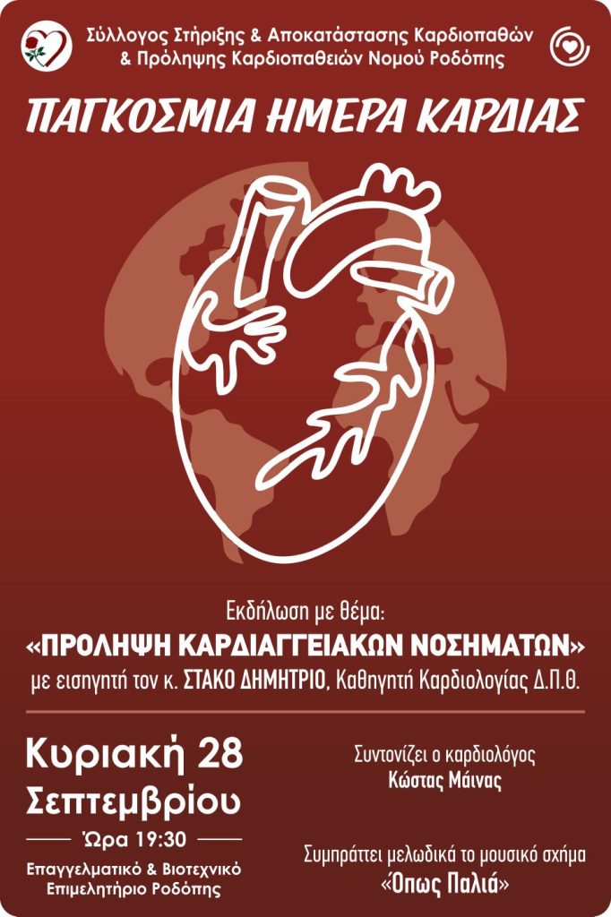 “Πρόληψη καρδιαγγειακών κοσημάτων” είναι το θέμα που θα αναπτύξει ο Καθηγητής Καρδιολογίας του Δημοκρίτειου Πανεπιστημίου Θράκης, Δημήτρης Στάκος, ως ο κεντρικός ομιλητής εκδήλωσης που διοργανώνει ο Σύλλογος Στήριξης και Αποκατάσταης Καρδιοπαθών Ροδόπης, την Κυριακή 28 Σεπτεμβρίου, στις 7:30 μ.μ., στο Επαγγελματικό & Βιοτεχνικό Επιμελητήριο Ροδόπης, ενόψει της Παγκόσμιας Ημέρας Καρδιάς (29/9).