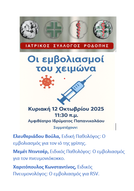 “Οι εμβολιασμοί του χειμώνα”, είναι το επίκαιρο θέμα ενημερωτικής εκδήλωσης που θα διοργανώσει ο Ιατρικός Σύλλογος Ροδόπης.