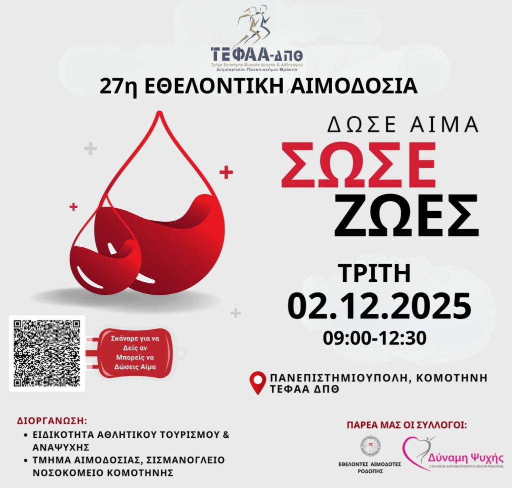 Στο πλαίσιο αυτό διοργανώνεται φέτος η 27η ετήσια εθελοντική αιμοδοσία που όπως κάθε χρόνο πραγματοποιείται χάρη στην εθελοντική διάθεση και την ακούραστη προσπάθεια των φοιτητών και φοιτητριών της ειδικότητας “Αθλητικού Τουρισμού & Αναψυχής”, καθώς και στην ευσυνειδησία και την επιστημονική επάρκεια των ιατρών και νοσηλευτών της Υπηρεσίας Αιμοδοσίας του “Σισμανόγλειου” Γενικού Νοσοκομείου Κομοτηνής.