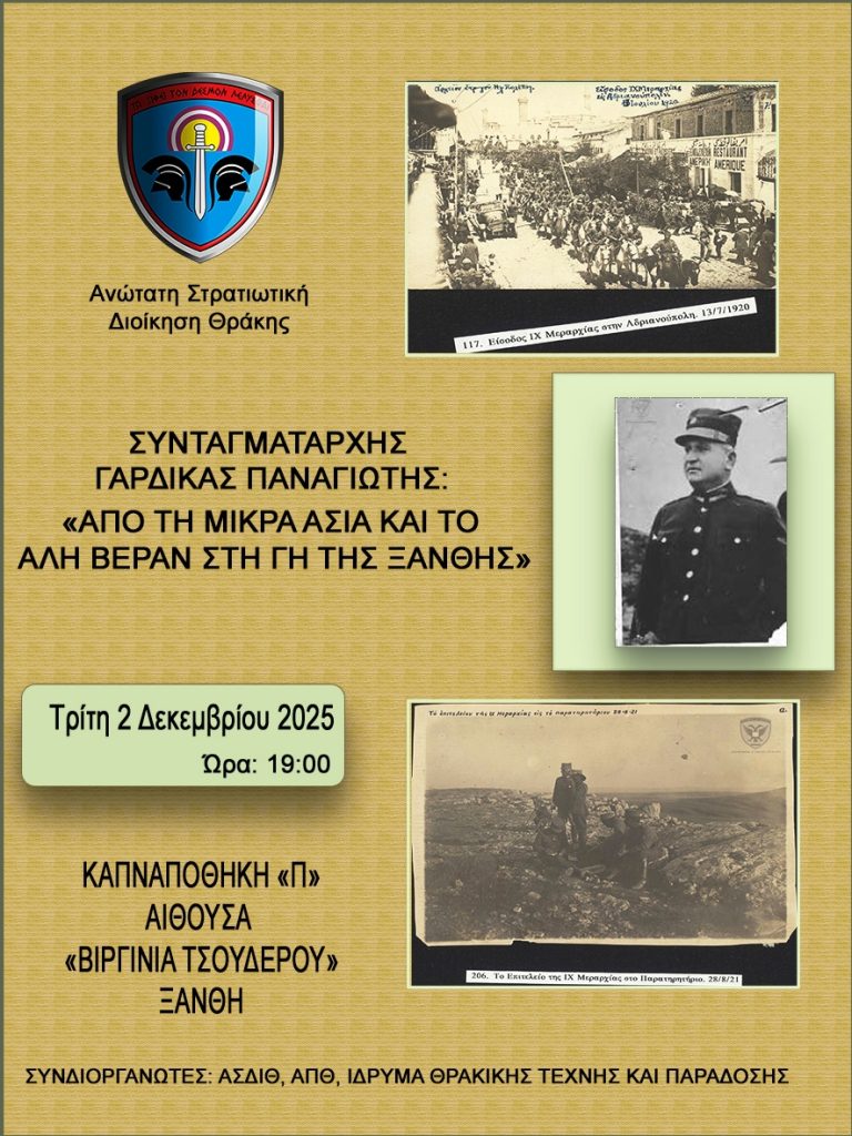 Τιμητική εκδήλωση στη μνήμη του Αντιστράτηγου Παναγιώτη Γαρδίκα, συνδιοργανώνουν, η Ανώτατη Στρατιωτική Διοίκηση Θράκης (τέως Δ΄ Σώμα Στρατού), το Δημοκρίτειο Πανεπιστήμιο Θράκης και το Ίδρυμα Θρακικής Τέχνης & Παράδοσης.
