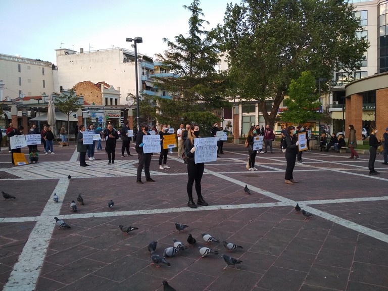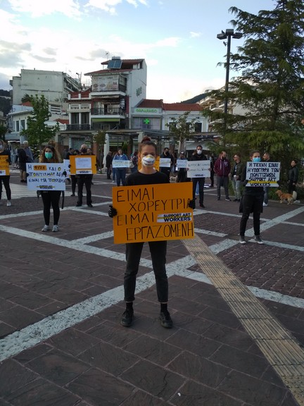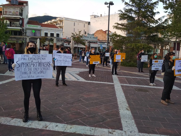 Καλλιτέχνες, ηθοποιοί, μουσικοί, χορευτές, τραγουδιστές, σκηνογράφοι, ηχολήπτες και εργαζόμενοι από το χώρο της τέχνης συγκεντρώθηκαν για να διεκδικήσουν την υποβοήθηση της Πολιτείας και για το δικό τους κλάδο, καθώς μέχρι σήμερα δεν έχει δοθεί στοχευμένη μέριμνα, λαμβάνοντας υπόψη τις ιδιαίτερες συνθήκες εργασίας στο χώρο του θεάματος και της ακρόασης.