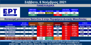 Στις 246, ανέρχονται οι νέες μολύνσεις του SARS-COV 2 στη Δυτική Μακεδονία, όπως ανακοίνωσε ο ΕΟΔΥ για Σάββατο 6 Νοεμβρίου 2021, εκ των οποίων: 15 στην Περιφερειακή Ενότητα Γρεβενών, 29 στην Περιφερειακή Ενότητα Καστοριάς, 164 στην Περιφερειακή Ενότητα Κοζάνης και 38 στην Περιφερειακή Ενότητα Φλώρινας.