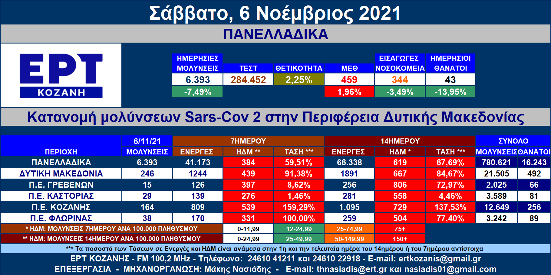 Μετά και τις νέες αυτές μολύνσεις οι Ενεργές Μολύνσεις, οι Ημερήσιοι Δείκτες Μολύνσεις, σε αναλογία 100.000 κατοίκων, τόσο στο 14ήμερο όσο και στο 7ήμερο, αλλά και οι θάνατοι έχουν διαμορφωθεί, Πανελλαδικά, όπως επίσης στη Δυτική Μακεδονία και στις τέσσερις Περιφερειακές Ενότητές της ως εξής: