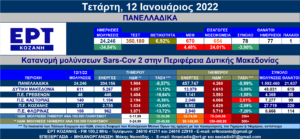 Στις 611 ανέρχονται οι νέες μολύνσεις του SARS-COV 2 στη Δυτική Μακεδονία, όπως ανακοίνωσε ο ΕΟΔΥ για Τετάρτη 12 Ιανουαρίου 2022, εκ των οποίων: 46 στην Περιφερειακή Ενότητα Γρεβενών, 140 στην Περιφερειακή Ενότητα Καστοριάς, 317 στην Περιφερειακή Ενότητα Κοζάνης και 108 στην Περιφερειακή Ενότητα Φλώρινας.