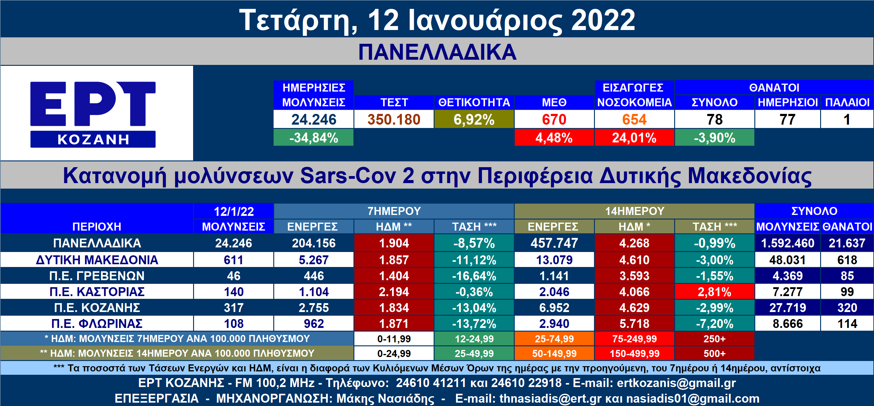 Μετά και τις νέες αυτές μολύνσεις οι Ενεργές Μολύνσεις, οι Ημερήσιοι Δείκτες Μολύνσεις, σε αναλογία 100.000 κατοίκων, τόσο στο 14ήμερο όσο και στο 7ήμερο, αλλά και οι θάνατοι έχουν διαμορφωθεί, Πανελλαδικά, όπως επίσης στη Δυτική Μακεδονία και στις τέσσερις Περιφερειακές Ενότητές της ως εξής:
