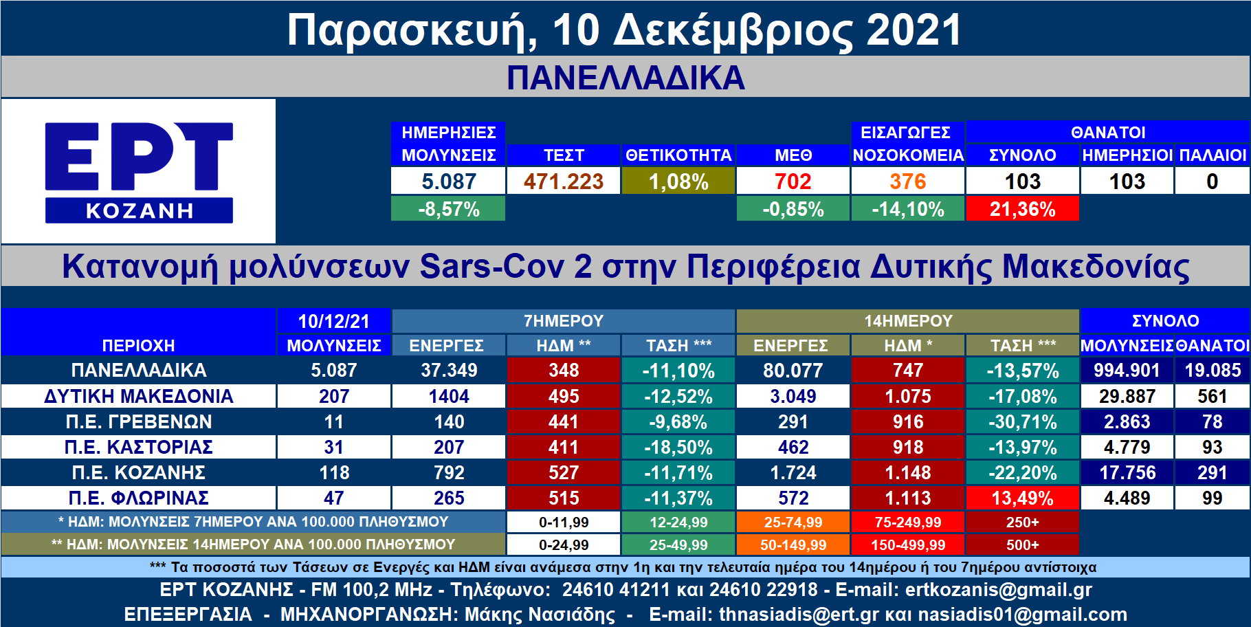 Μετά και τις νέες αυτές μολύνσεις οι Ενεργές Μολύνσεις, οι Ημερήσιοι Δείκτες Μολύνσεις, σε αναλογία 100.000 κατοίκων, τόσο στο 14ήμερο όσο και στο 7ήμερο, αλλά και οι θάνατοι έχουν διαμορφωθεί, Πανελλαδικά, όπως επίσης στη Δυτική Μακεδονία και στις τέσσερις Περιφερειακές Ενότητές της ως εξής: