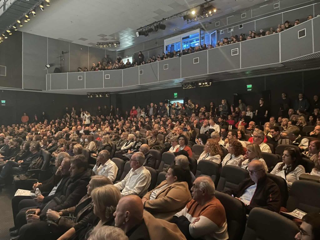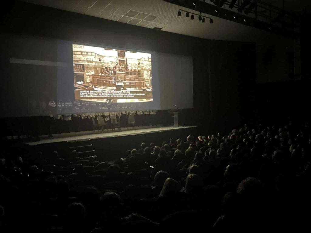 Η αίθουσα ήταν γεμάτη, με πολίτες διαφορετικών ηλικιών να δίνουν το παρών και να αποδεικνύουν έμπρακτα πως η μνήμη και η διεκδίκηση δικαιοσύνης για την τραγωδία παρμένου ζωντανές. Στο βήμα ανέβηκαν συγγενείς θυμάτων της τραγωδίας – η Ρούλα Τζοβάρα, η Σμαρώ Οικού, ο Πάνος Ρούτσι και η Μαρία Καρυστιανού. Ιδιαίτερα αιχμηρή ήταν η τοποθέτηση της Μαρίας Καρυστιανού, η οποία καταφέρθηκε κατά κυβερνητικών επιλογών αλλά και συνολικά κατά του πολιτικού συστήματος, υποστηρίζοντας πως η τραγωδία θα μπορούσε να είχε αποφευχθεί εάν λειτουργούσαν τα ηλεκτρονικά συστήματα ασφαλείας και τηλεδιοίκησης. Έκανε λόγο για «ευθύνες που δεν αποδόθηκαν» και για «προσπάθειες συγκάλυψης», τονίζοντας ότι σχεδόν τρία χρόνια μετά το δυστύχημα «κανείς δεν έχει τιμωρηθεί».