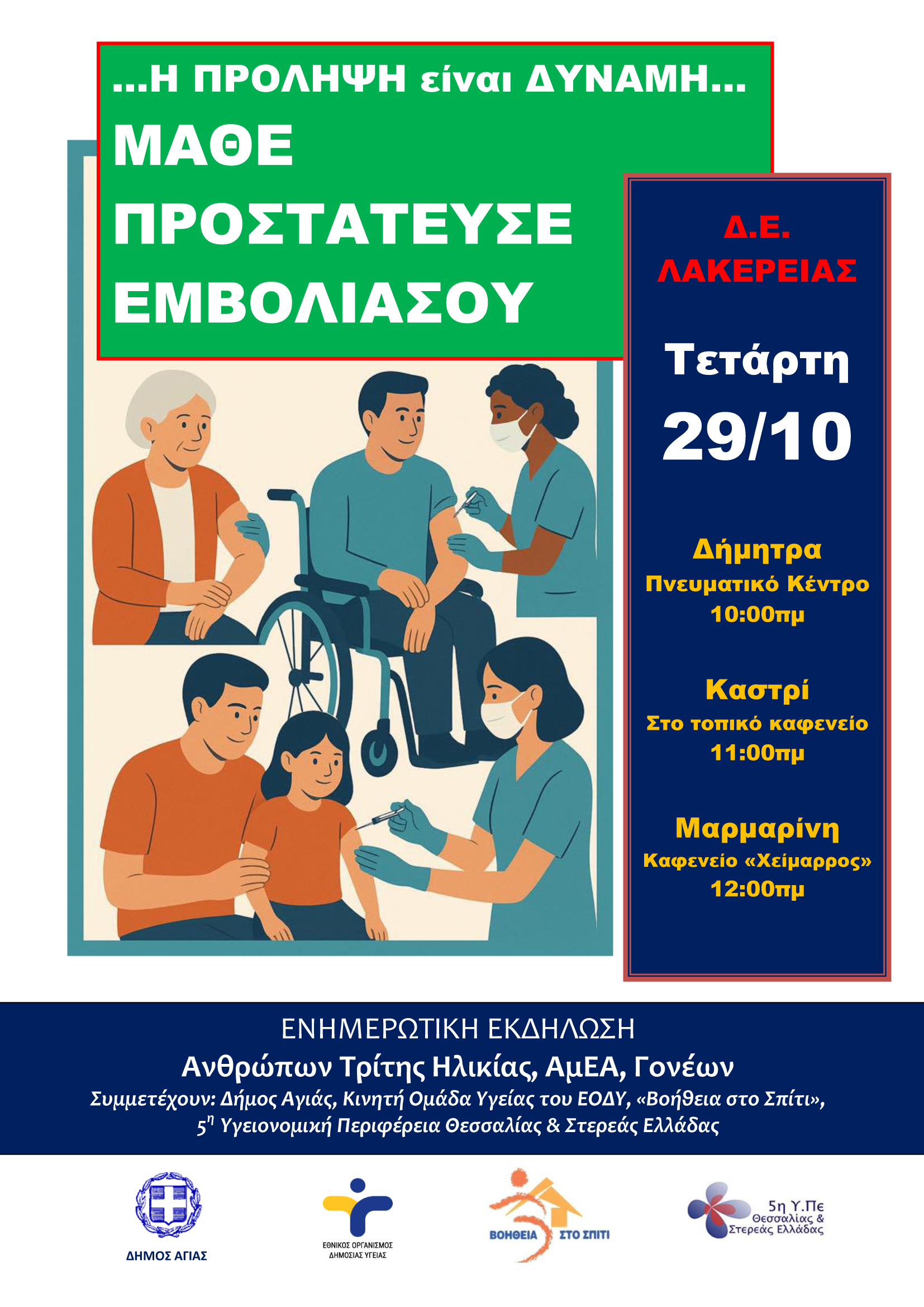 Δράσεις ενημέρωσης για την αξία του εμβολιασμού σε όλες τις Δημοτικές Ενότητες του Δήμου οργανώνει ο Δήμος Αγιάς, σε συνεργασία με τις Κινητές Μονάδες ΕΟΔΥ της 5ης Υγειονομικής Περιφέρεις, με σκοπό την ενημέρωση των πολιτών στην περιφέρεια του Δήμου σχετικά με την πρόληψη και την φροντίδα υγείας.