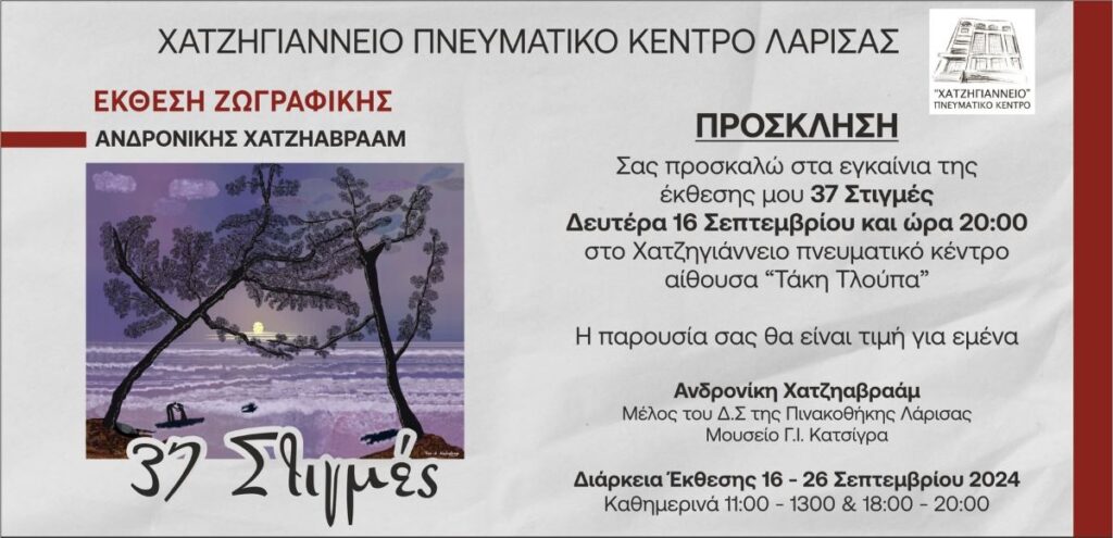 Την πρώτη της έκθεση ζωγραφικής, με τίτλο «37 Στιγμές», εγκαινιάζει τη Δευτέρα 16 Σεπτεμβρίου στις 20:00 η εικαστικός Ανδρονίκη Χατζηαβραάμ στο Χατζηγιάννειο Πνευματικό Κέντρο Λάρισας – Αίθουσα «Τάκης Τλούπας».