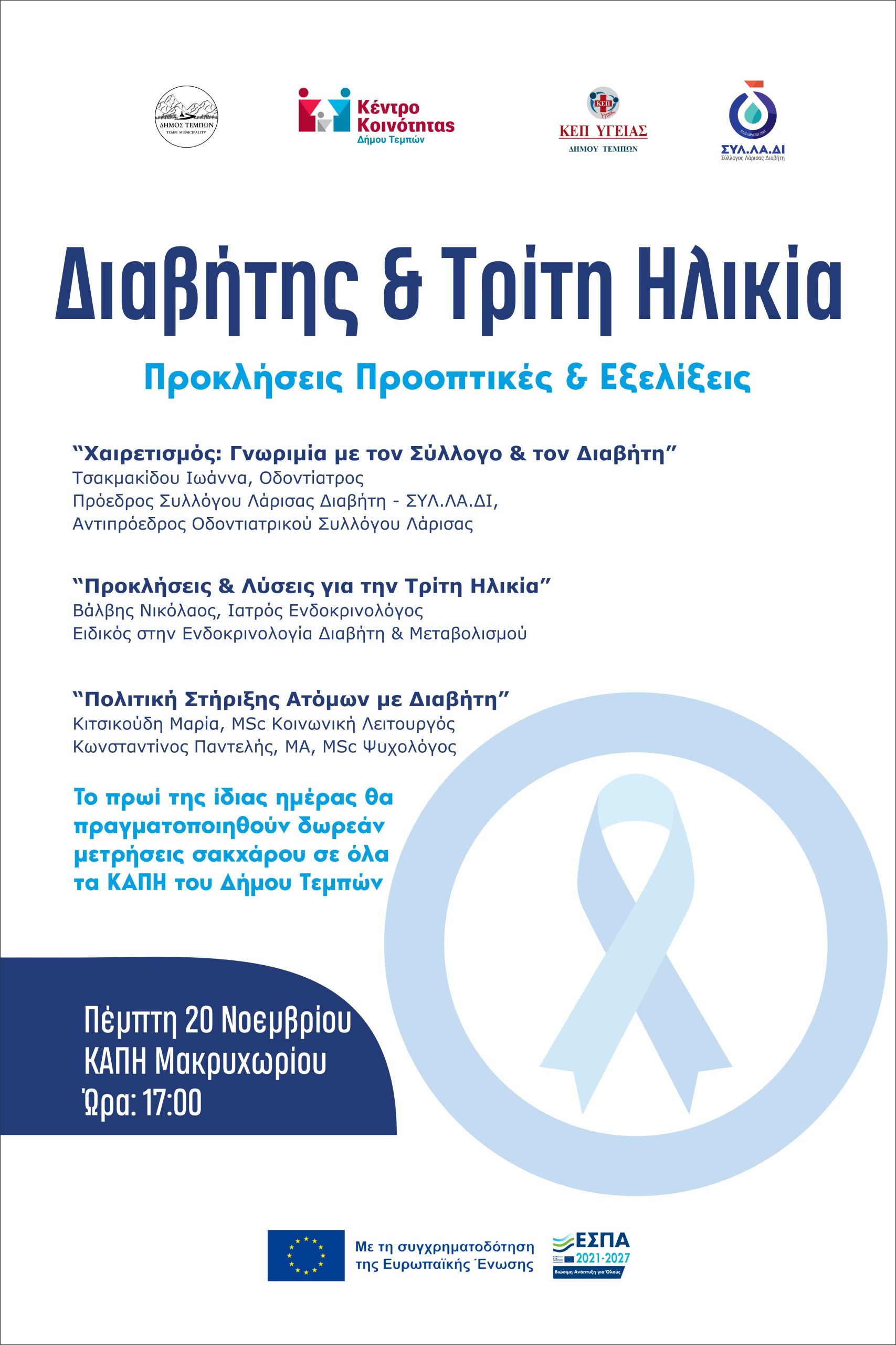 Το Κέντρο Κοινότητας και το ΚΕΠ Υγείας του Δήμου Τεμπών, σε συνεργασία με τον Σύλλογο Λάρισας Διαβήτη (ΣΥΛ.ΛΑ.ΔΙ), διοργανώνουν την Πέμπτη 20 Νοεμβρίου 2025, στις 17:00, στο ΚΑΠΗ Μακρυχωρίου, ενημερωτική εκδήλωση με τίτλο: