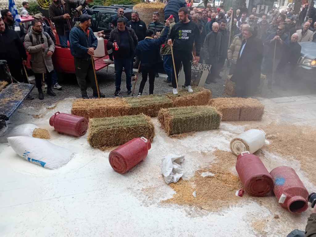 Οι κτηνοτρόφοι, εισήλθαν κορνάροντας με τα αγροτικά οχήματα τους στην πλατεία και στη συνέχεια φτάνοντας μπροστά από το Δικαστικο Μέγαρο έχυσαν γάλα, και έριξαν ζωοτροφές και μπάλες με άχυρο, δηλώνοντας την αγανάκτηση τους, σε μια συμβολική ενέργεια ανάδειξης των οξυμένων προβλημάτων της κτηνοτροφίας.