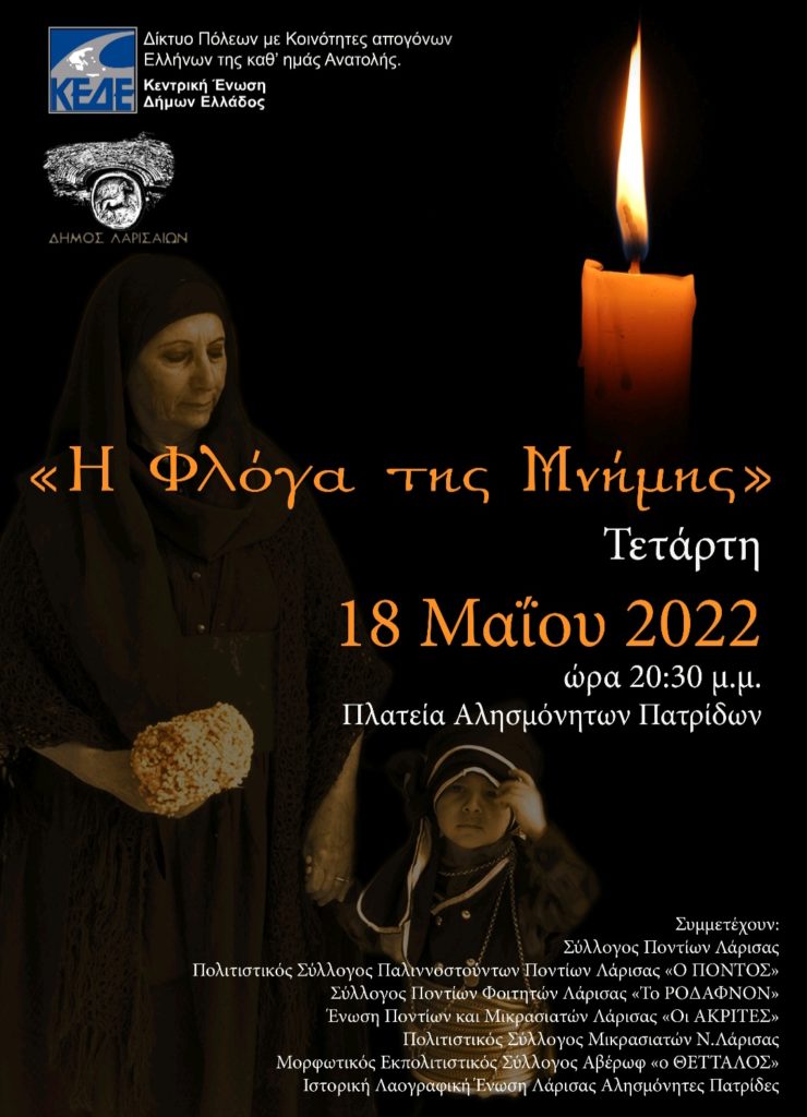 Στο πλαίσιο αυτό ο Δήμος Λαρισαίων διοργανώνει λιτή εκδήλωση «Η ΦΛΟΓΑ ΤΗΣ ΜΝΗΜΗΣ», με την συνδρομή τοπικών φορέων την Τετάρτη 18 Μαΐου 2022 και ώρα 20:30, στην Πλατεία Αλησμόνητων Πατρίδων, στο Μνημείο της Γενοκτονίας του Ποντιακού Ελληνισμού.