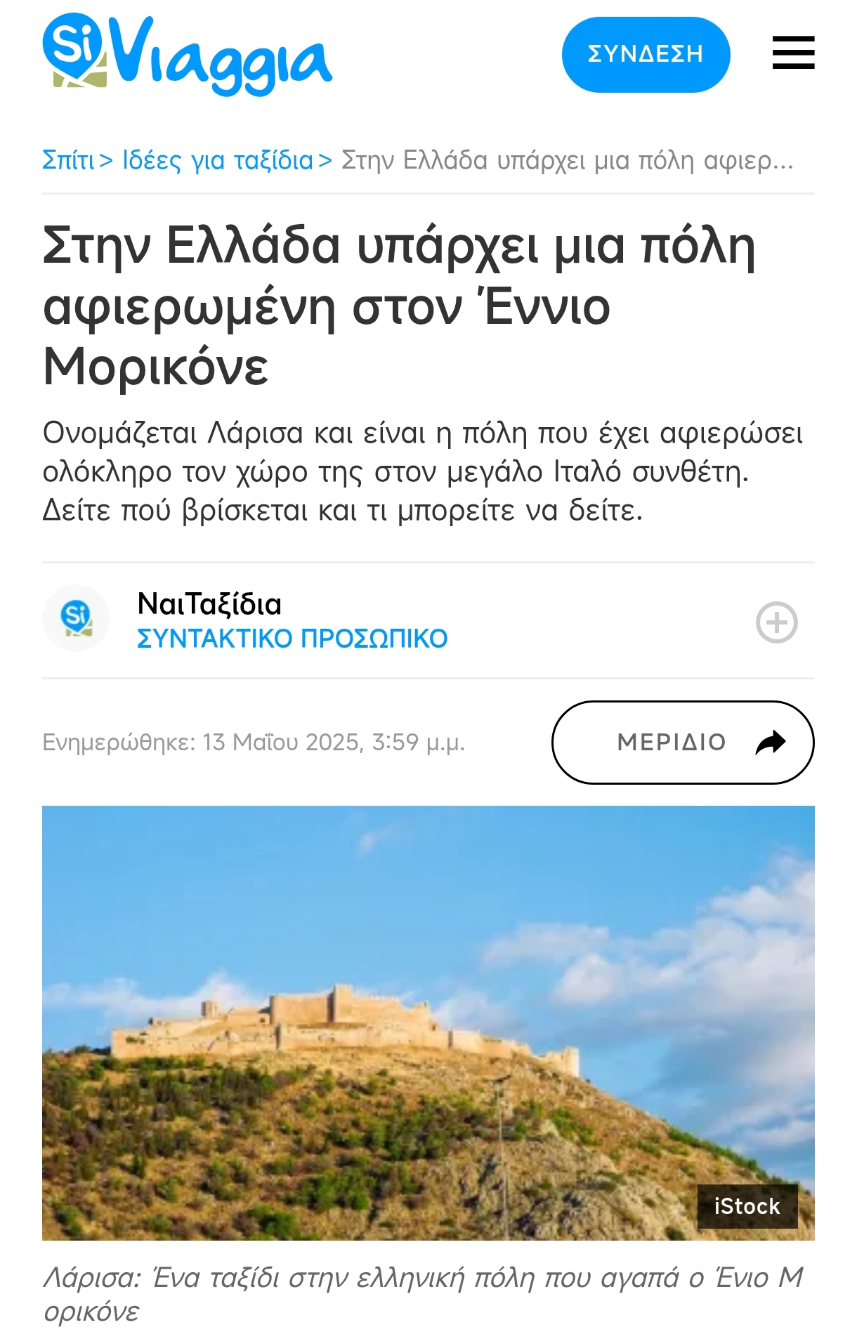 “Λάρισα, η ελληνική πόλη που ερωτεύτηκε τον Ένιο Μορικόνε” αναφέρει σε άρθρο του το ιταλικό portal SiViaggia.it κάνοντας εκτενή αναφορά στη Λάρισα, τις μεγάλες τοιχογραφίες που συνδέονται με τον μεγάλο συνθέτη και που κοσμούν το κέντρο της πόλης και τον Πολιτιστικό Σύλλογο Φίλων της Μουσικής του Ένιο Μορικόνε που δημιουργήθηκε στη Λάρισα και με τις δράσεις του οι Λαρισαίοι γνώρισαν, αγάπησαν και αγκάλιασαν το έργο του Μαέστρο.