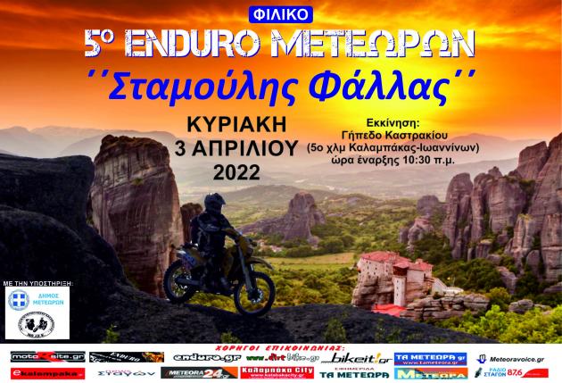 Η εκκίνηση του φιλικού Enduro Μετεώρων θα πραγματοποιηθεί το πρωί της Κυριακής 3/4/2022 και ώρα 10:30 π.μ. από το γήπεδο Καστρακίου και ο τερματισμός μετά από 75 χλμ. διαδρομής θα είναι το ίδιο σημείο.