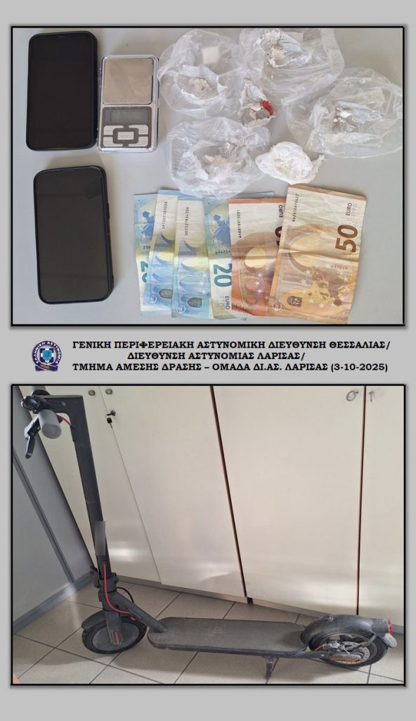 Ειδικότερα, αστυνομικοί της Ομάδας Δ.Ι.ΑΣ. Λάρισας, εντόπισαν τα δυο άτομα σε εγκαταλελειμμένο κτίριο και σε έλεγχο, βρέθηκαν 6 νάιλον συσκευασίες με ποσότητες κοκαΐνης, συνολικού βάρους 6,2 γραμμαρίων, ζυγαριά ακριβείας, ηλεκτρικό πατίνι, ως μέσο διευκόλυνσης της παράνομης δραστηριότητάς τους, 2 κινητά τηλέφωνα, καθώς και το χρηματικό ποσό των 140 ευρώ.