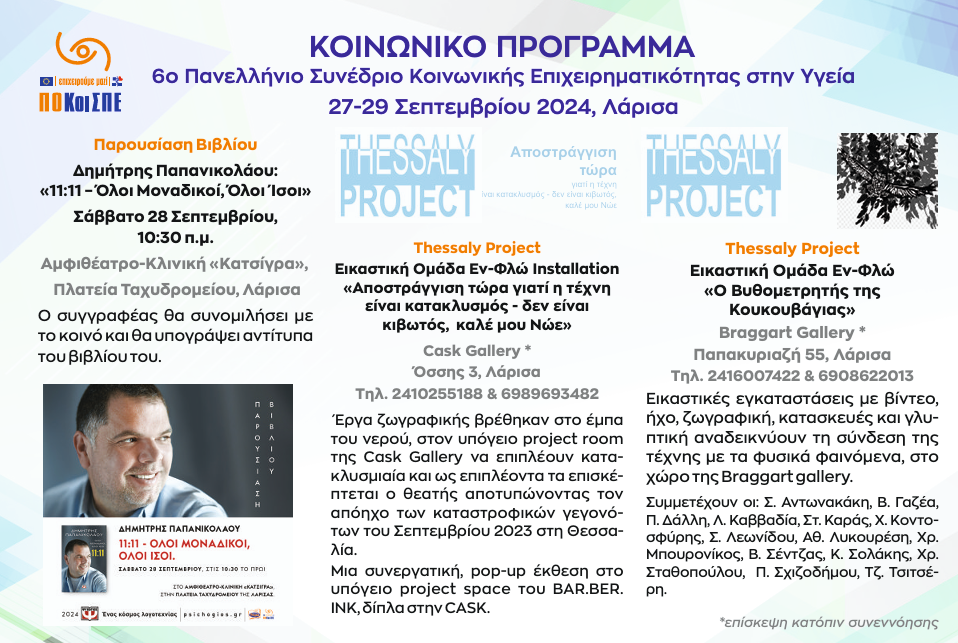 - Thessaly Project – Εικαστική Ομάδα Εν-Φλώ Installation “Αποστράγγιση τώρα γιατί η τέχνη είναι κατακλυσμός – δεν είναι κιβωτός, καλέ μου Νώε“. Έργα ζωγραφικής βρέθηκαν στο έμπα του νερού, στον υπόγειο project room της Cask Gallery να επιπλέουν κατακλυσμιαία και ως επιπλέοντα τα επισκέπτεται ο θεατής αποτυπώνοντας τον απόηχο των καταστροφικών γεγονότων του Σεπτεμβρίου 2023 στη Θεσσαλία. Cask Gallery ( Οσσης 3, Λάρισα)