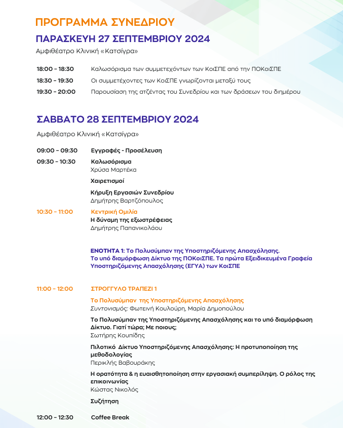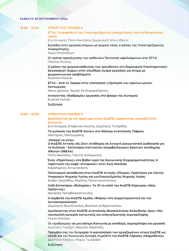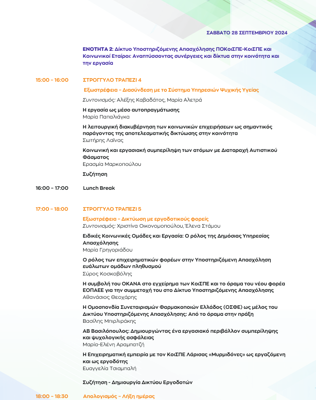 · Ενότητα 2: Δίκτυο Υποστηριζόμενης Απασχόλησης ΠΟΚοιΣΠΕ-ΚοιΣΠΕ και Κοινωνικοί Εταίροι: Αναπτύσσοντας συνέργειες και δίκτυα στην κοινότητα και την εργασία.