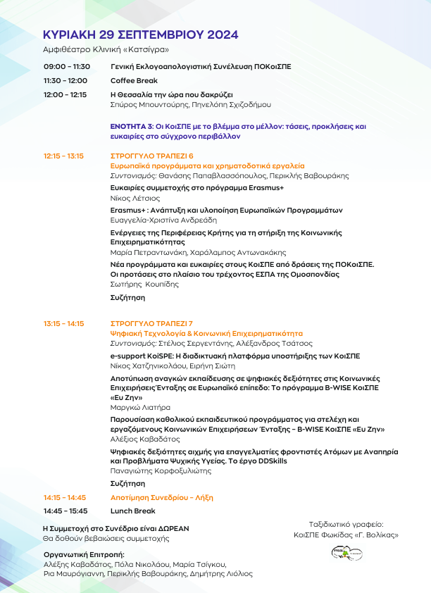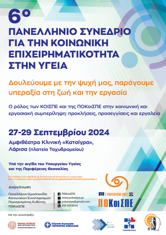 Η Πανελλήνια Ομοσπονδία Κοινωνικών Συνεταιρισμών Περιορισμένης Ευθύνης (ΠΟΚοιΣΠΕ) διοργανώνει το 6ο Πανελλήνιο Συνέδριο Κοινωνικής Επιχειρηματικότητας στην Υγεία, το οποίο θα πραγματοποιηθεί από τις 27 έως τις 29 Σεπτεμβρίου 2024 στο Αμφιθέατρο της Κλινικής «Κατσίγρα» στη Λάρισα (πλ. Ταχυδρομείου). Το συνέδριο τελεί υπό την αιγίδα του Υπουργείου Υγείας και της Περιφέρειας Θεσσαλίας και φέρει τον τίτλο: «Δουλεύουμε με την ψυχή μας, παράγουμε υπεραξία στη ζωή και την εργασία. Ο ρόλος των ΚοιΣΠΕ και της ΠΟΚοιΣΠΕ στην κοινωνική και εργασιακή συμπερίληψη: προκλήσεις, προσεγγίσεις και εργαλεία».