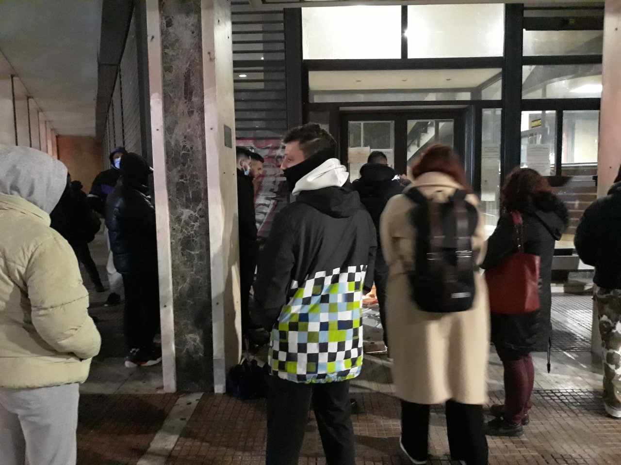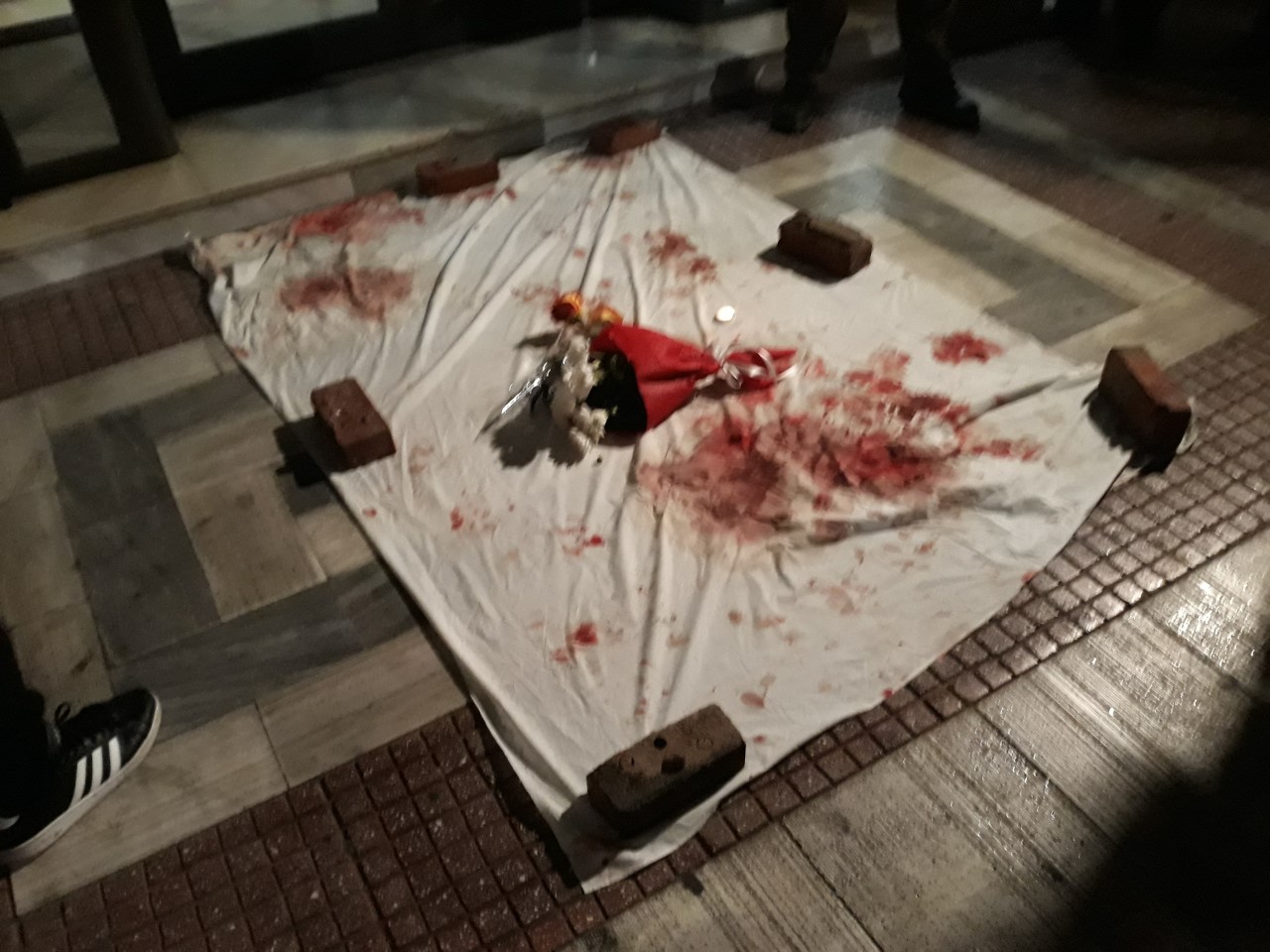 Μπροστά από την είσοδο του δημαρχείου Λάρισας άπλωσαν το ματωμένο πανί, αλλά και λίγα τούβλα από τον μοιραίο τοίχο όπου ο άτυχος νέος έχασε άδικα την ζωή του.