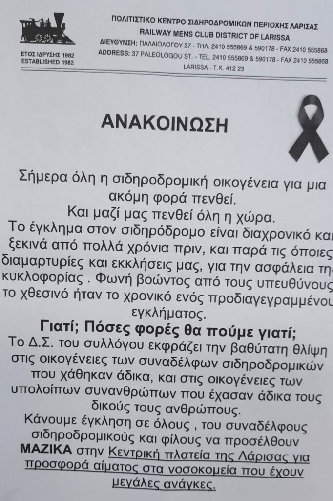 Εν τω μεταξύ κάλεσμα σε όλους τους σιδηροδρομικούς υπαλλήλους για προσφορά αίματος που πραγματοποιείται στην κεντρική πλατεία της Λάρισας απευθύνει το Πολιτιστικό Κέντρο Σιδηροδρομικών περιοχής Λάρισας.