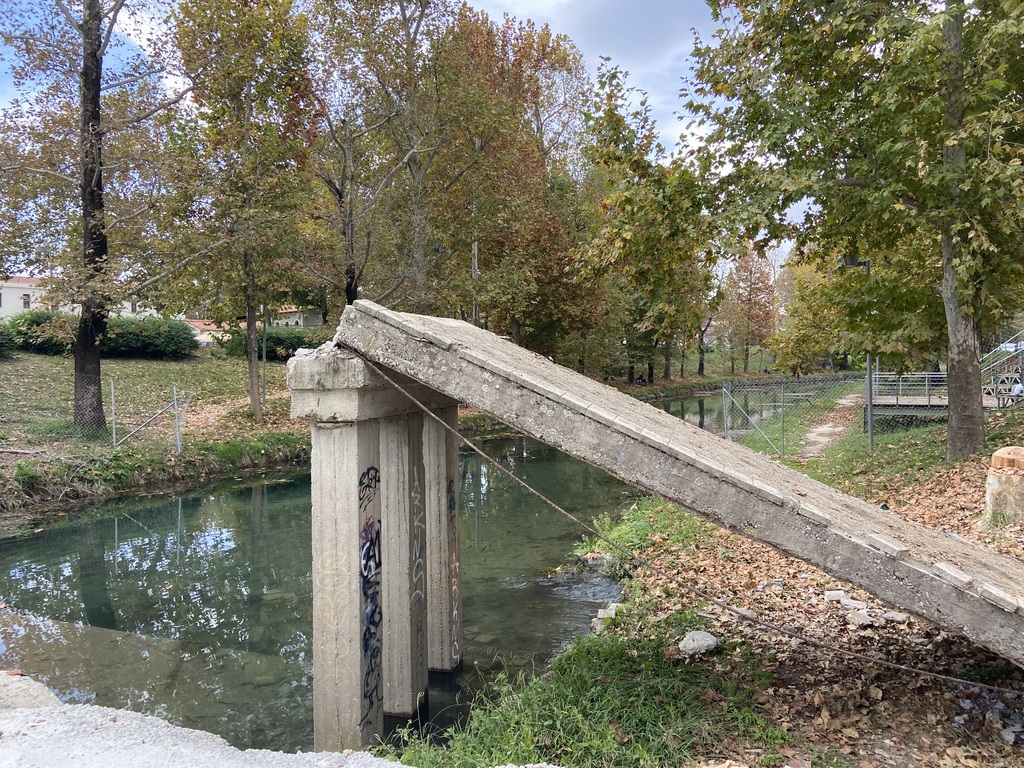 Παρελθόν αποτελεί, η κατασκευασθείσα το 1961 πεζογέφυρα του Αγίου Κωνσταντίνου στα Τρίκαλα, η οποία είχε υποστεί ζημιές από τις πλημμύρες του Σεπτεμβρίου του 2023. Η εταιρεία που έχει αναβάλει το μεγάλο έργο της αποκατάστασης και συντήρησης των 13 γεφυριών της πόλης, προέβη στον γκρέμισμά της. Η γέφυρα ήταν επισήμως ανενεργή από την περίοδο του Daniel, καθώς η πλημμύρα την κατέστησε επικίνδυνη για τους πεζούς, με τον Δήμο Τρικκαίων να τοποθετεί πινακίδες απαγόρευσης διέλευσης.